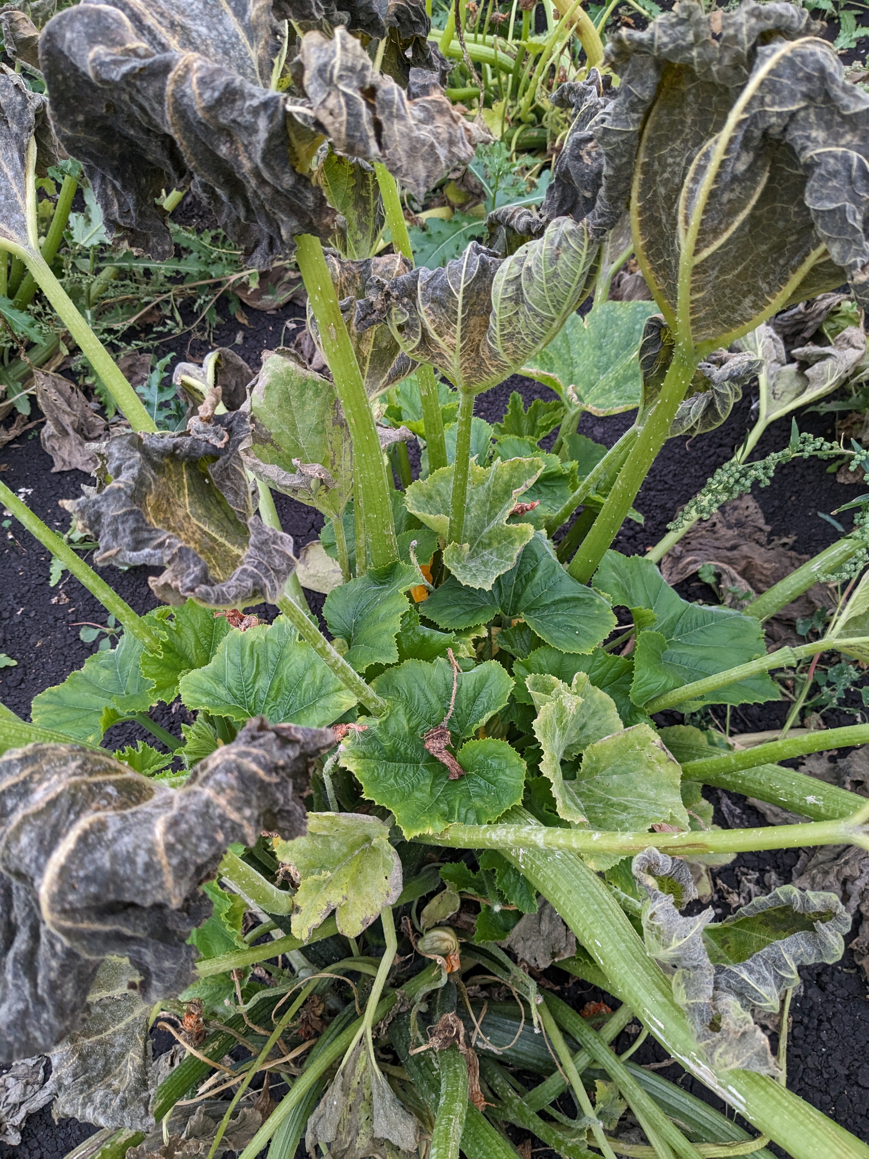 Even though we had some very light frost….not all plants are down and out, even sensitive ones. Though the top leaves of our Patty Pan Squash crop was damaged by frost, the rest of the plant was able to hang on. With some nice weather following, the plants are starting to rebound….we may even get one last pick of fruit.