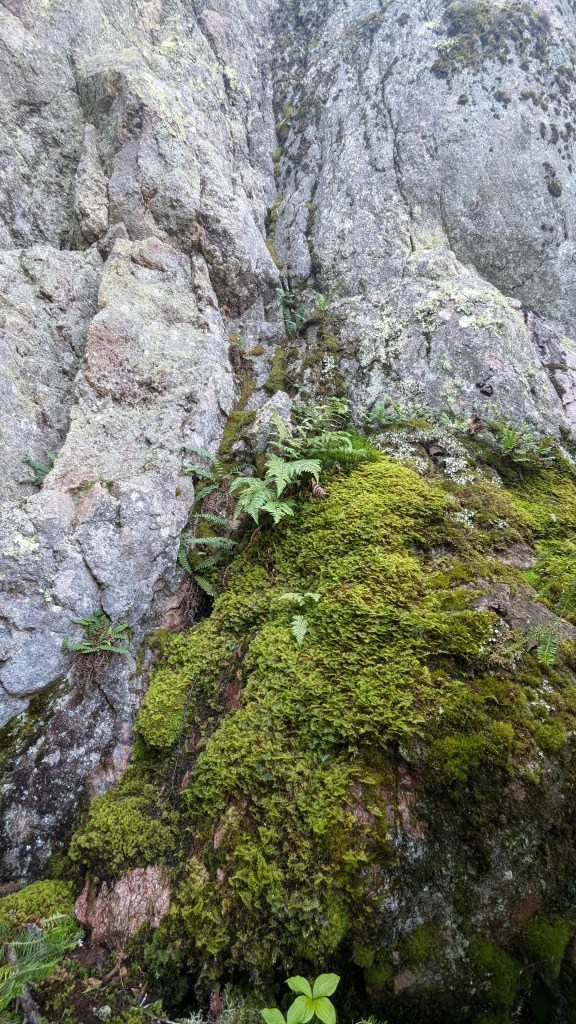 Something that is really noticeable in a forest like this is how many layers there are and how nearly total the sunlight capture is: the forest canopy, the understory, and moss-covered everything on the forest floor. The only places where light does not hit something photosynthesizing are the exposed ancient shield rocks…and even those are covered in lichens.