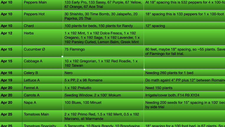 I know there are programs out there to help with seeding schedules and such, but I have found that I enjoy the exercise of updating this specific schedule to our own specific farm, tailored for what we need to get accomplished, and what works for us.