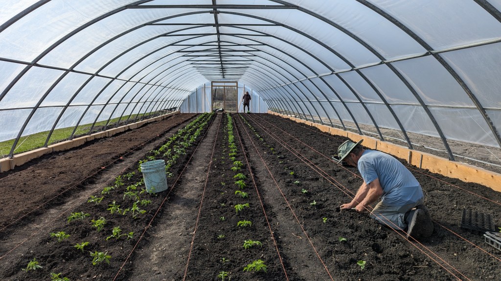 Are the spacings too close? Too far? Are we wasting our time with determinate tomatoes in a greenhouse? Can we keep up with trellising? Are we going to walk in here one day and wonder what we were thinking on this day, May 7th, 2025, when we first started planting in our new hoop house.