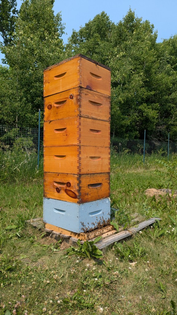 After I took the 3 boxes of spring honey I added 5 new boxes to give them space for the expanding hive and in anticipation of the main summer honey flow. For the past three weeks I’ve been battling swarming behaviour…which is to say the hive has decided they have ample resources and not enough space, and will split themselves to reproduce. They’ve mostly filled approximately 3/4 of the 5 new boxes by weight ( a full box weighs about 70 pounds) and the queen has little room to lay more eggs.