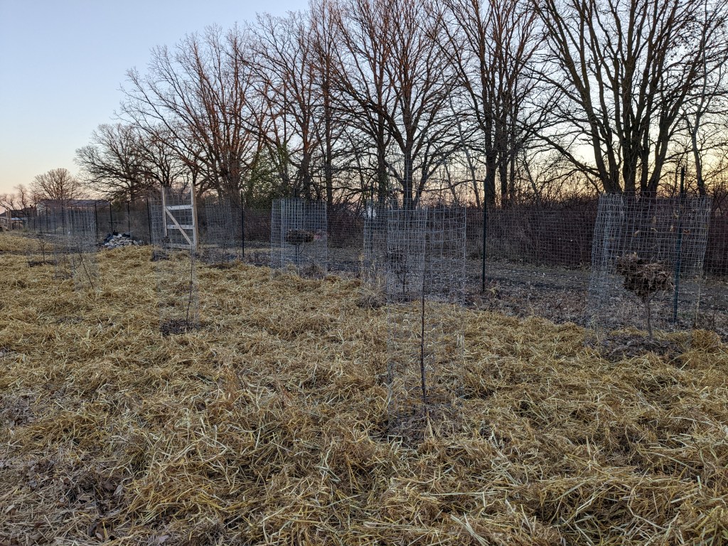 It didn’t go very well, because all that happened for the first couple years was that I killed a whole bunch of trees. Due to my own negligence and complete lack of care. But I kept buying a few more trees and in 2020, I decided the location was awful (I would later find out I was correct) so I moved them to the back corner in the dappling shade of the most towering Oaks in the south tree line.By 2021 trees kept surviving (mostly), so I kept buying a few more to replace the ones that didn’t make it, and a few more, and by 2022 I had about 10 trees well on their way. I mulched the whole “orchard area” and protected my skinny fledgling whips with chicken wire in the winter to prevent deer from snacking on these precariously fragile sticks that I had wobbled my way through three or four years trying to get going.