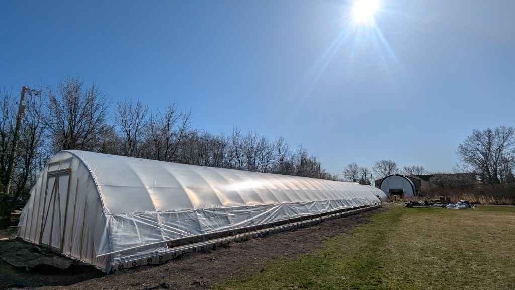 Twice in a row we were thwarted by moisture trying to get the plastic up on the greenhouse. The tiniest bit of moisture on the ground would have made an absolute mess on the plastic, so we’ve had to punt for sunnier days. Cloudiness or rain can gum up the works sometimes.
