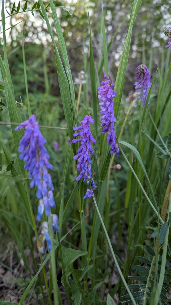 This colony had already plugged out 2 honey supers, and each box weighed easily 60 pounds. This hive needed room fast, as both vetch and alfalfa are just starting to bloom now, which will fuel the honey flow even more. So I added 2 more supers in anticipation of the hive’s ability to keep going.Here’s some Vetch…it’s a pretty purple flower with a sort of vine leaf. The plant appears delicate but, if you try to pull it out, you will be able to feel how strong that little vine-like stem is.