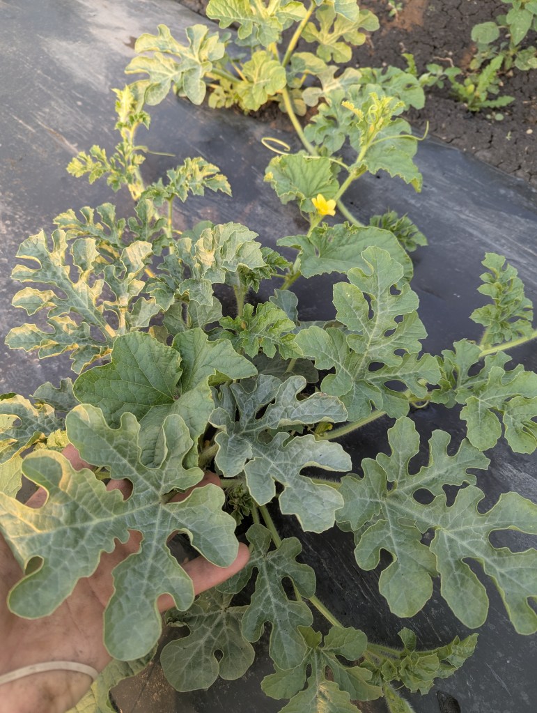 Well what happened was surprising…the late-seeded watermelon popped out of the ground and grew extremely fast in the heat. I can’t say I’ve seen leaves of this size on transplanted plants either. Some are even starting to set their first flowers. It seems the watermelon love the mulch that warms up the soil a bit, and all cucurbits hate being transplanted.